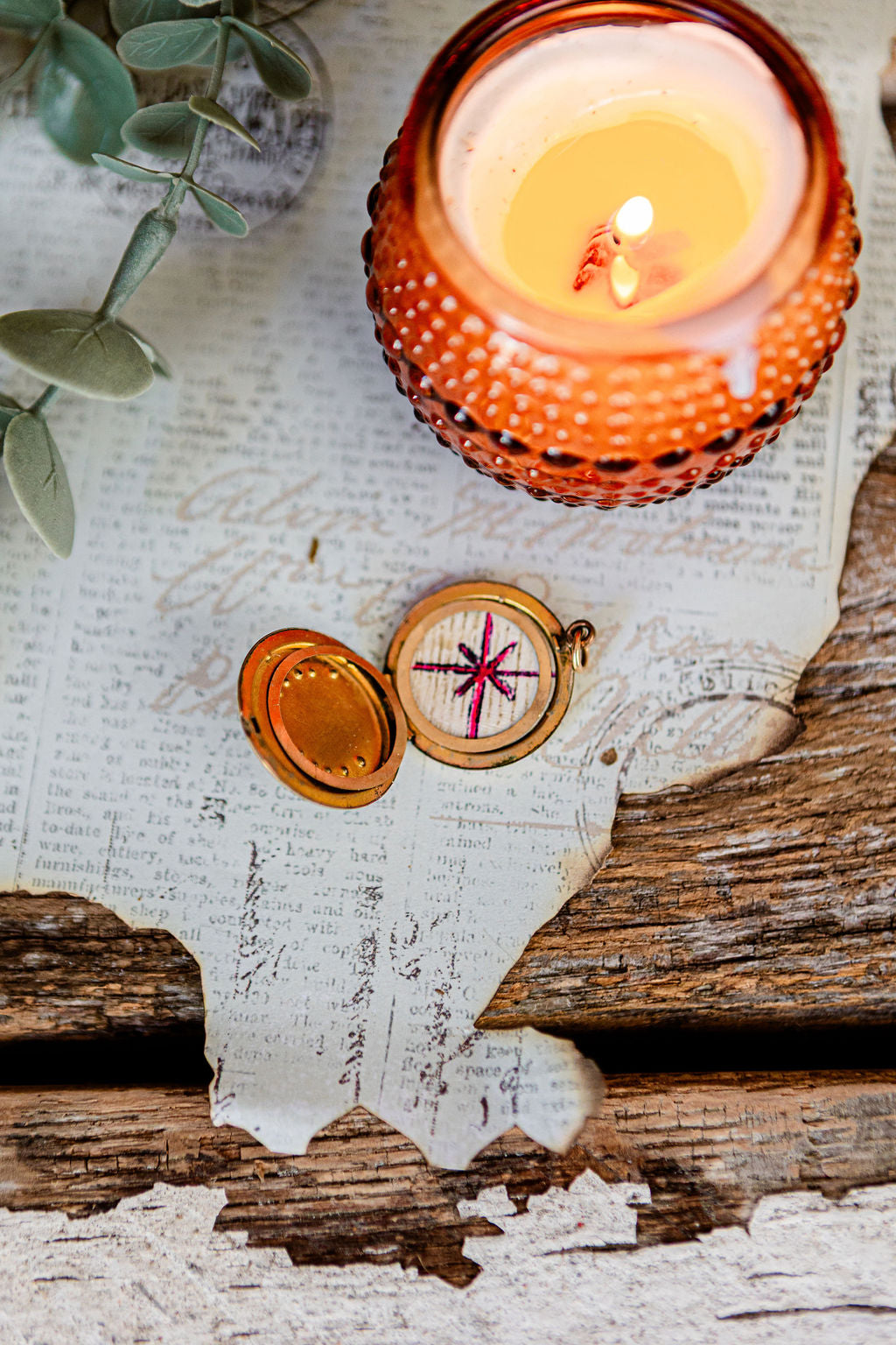 Victorian locket necklace, dated 1874, with engraved floral detailing on the front. Gold-tone setting on a fine chain. Opens to reveal space for a small keepsake, currently holding a page fragment with a star motif.