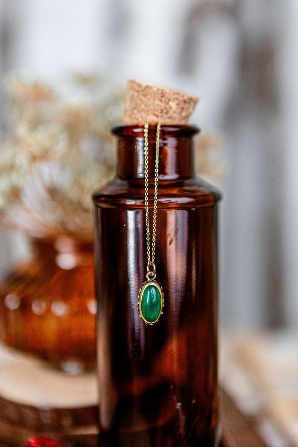 Gold-tone pendant necklace with an oval green stone, possibly chalcedony, in a simple bezel setting. Conversion piece, originally a Victorian hat pin, now set on a delicate chain.